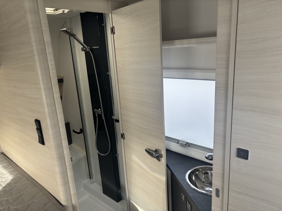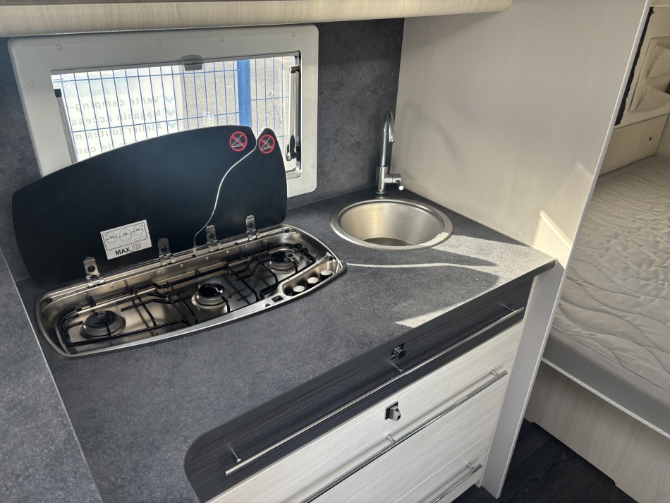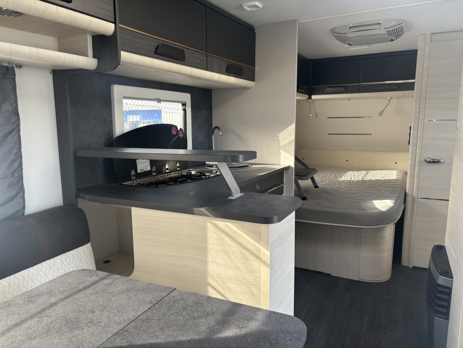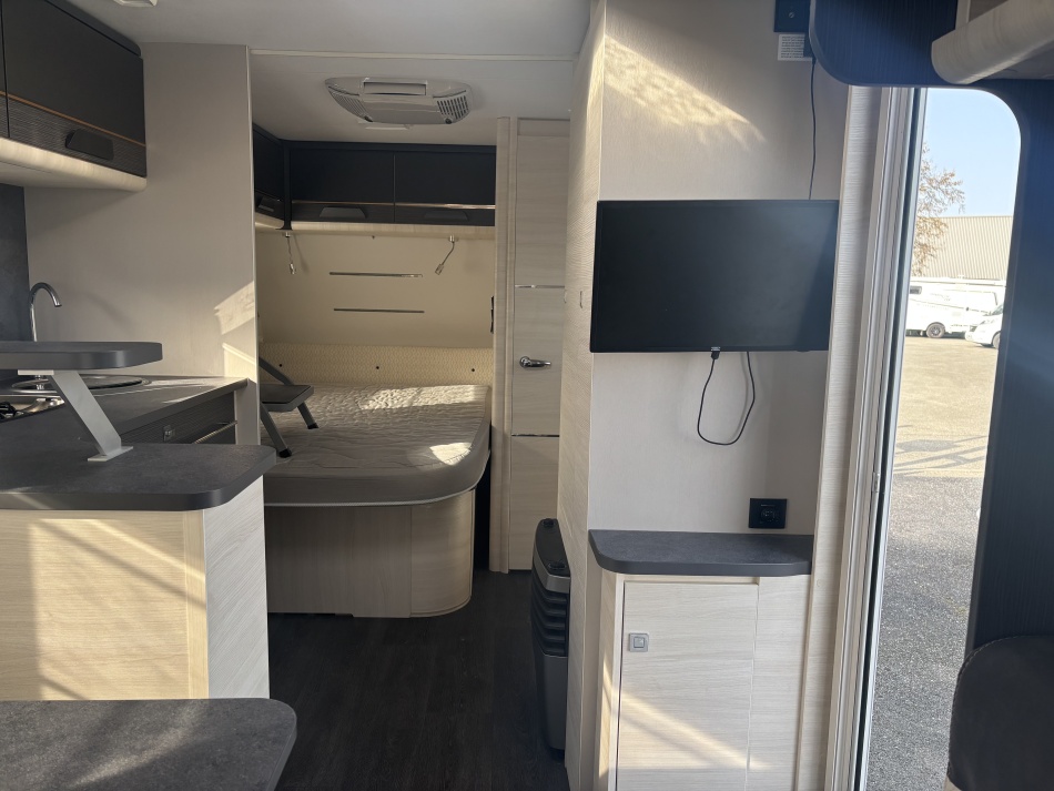 Couchages (4 personnes) •Grand lit fixe 150 x 198 cm avec sommier à lattes et matelas confort •Salon en U transformable en grand couchage 140 x 210 cm - Cuisine spacieuse Réfrigérateur XL à compression 150 L avec tiroir congélateur Réchaud 3 feux Évier inox Nombreux rangements - Salle d’eau & WC Cabinet de toilette avec WC cassette électrique Douche intégrée avec colonne Coin salle d’eau avec cuve inox et douchette extensible (utilisable vers l’extérieur) Très nombreux rangements Penderie Grande étagère - Confort toutes saisons Climatisation réversible chaud / froid Chauffage combiné électrique 230V et gaz Chauffage central diffusé par plusieurs bouches d'aération pour une chaleur homogène Chauffe-eau Truma Combi Réservoir eau propre 50 L Réservoir eaux usées 30 L à roulettes - Autonomie Batterie permettant 2 à 3 jours d’autonomie complète en 12V (y compris réfrigérateur) - Sécurité & structure Anti-lacet AKS 3004 Amortisseurs et vérins renforcés Isolation IRP (toit, parois, sous-plancher polyester renforcé) Revêtement anti-grêle Nombreux éclairages LED -Auvent gonflable 6 chaises Trigano Grande table pliante