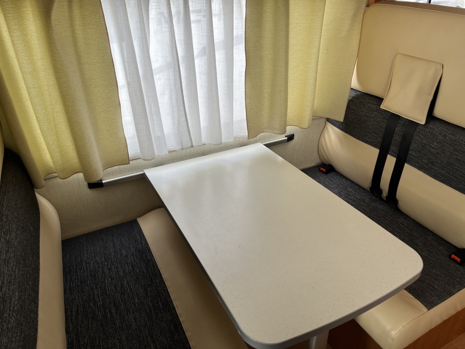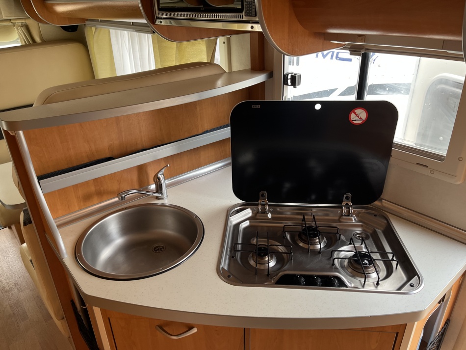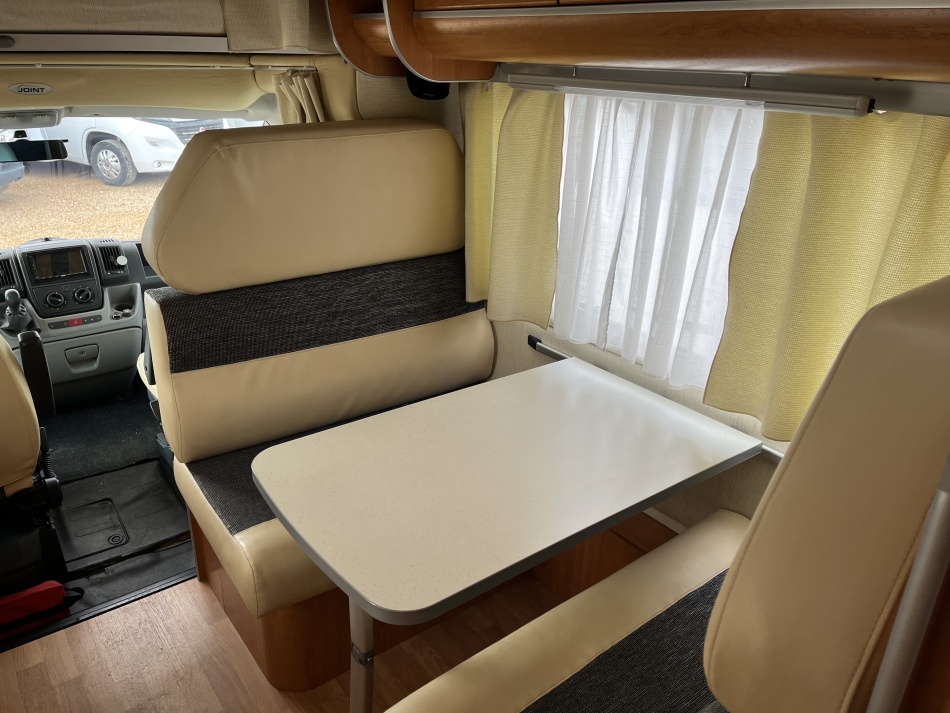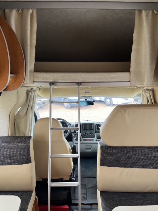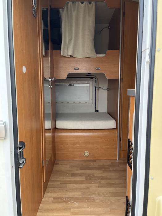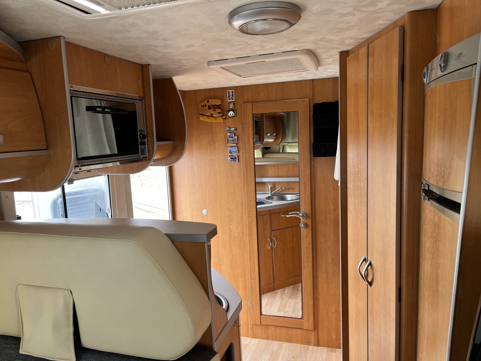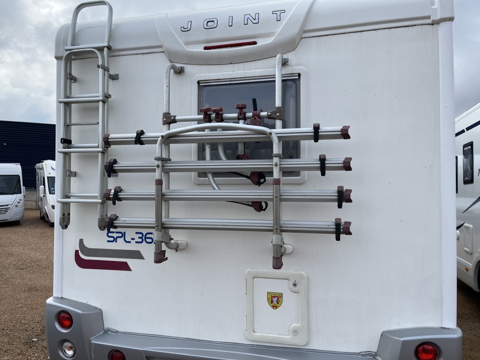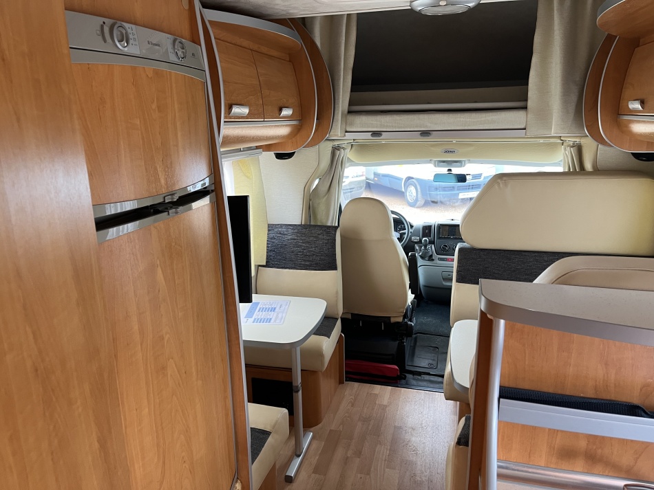 EQUIPEMENTS DE SERIE : 4 couchages permanents (2 en capucine + 2 superposés) et + 3 sur dînette amovible avec rallonges • Grande salle de bain, douche avec parois et WC séparés • Frigo dometic trimix 150l (avec congélateur) • ChauffageTRUMA • 1× Panneau solaire • Four gaz • Tv connecté • Double plancher • Toiture anti grêle • Réservoir eau propre 120L / 100L eaux usées • Stabilisateur de sol sous caisse • Store gris/gris clair • Caméra de recul • Porte vélo 4 places